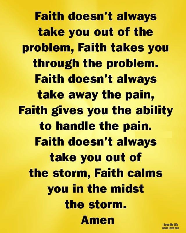 Faith is not the cure all for all your troubles, pains, and fears. Faith is the ability to walk thru your troubles, pains, and freaks knowing that you are not alone and that you will see your way out of it.